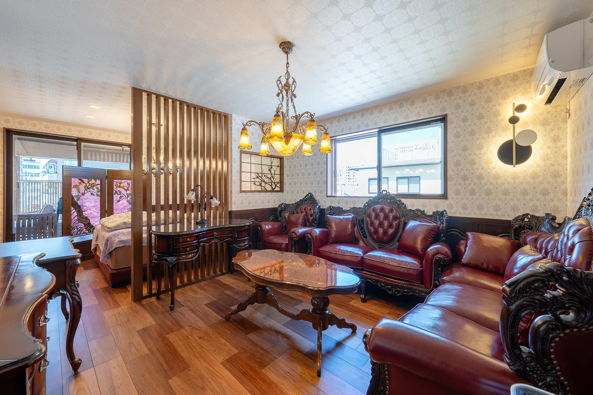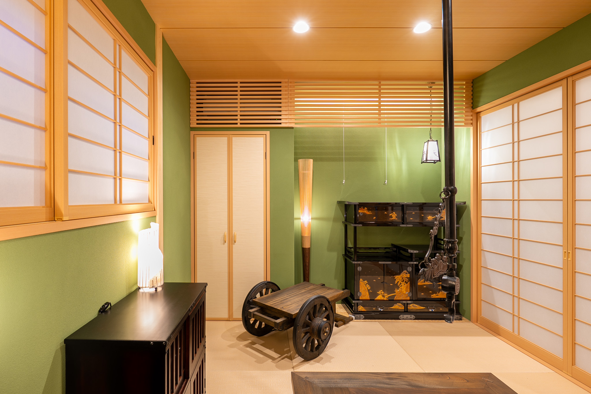 旅館のようなおもてなし空間は、エアコンを格子細工で隠すなど細やかな気配りが。