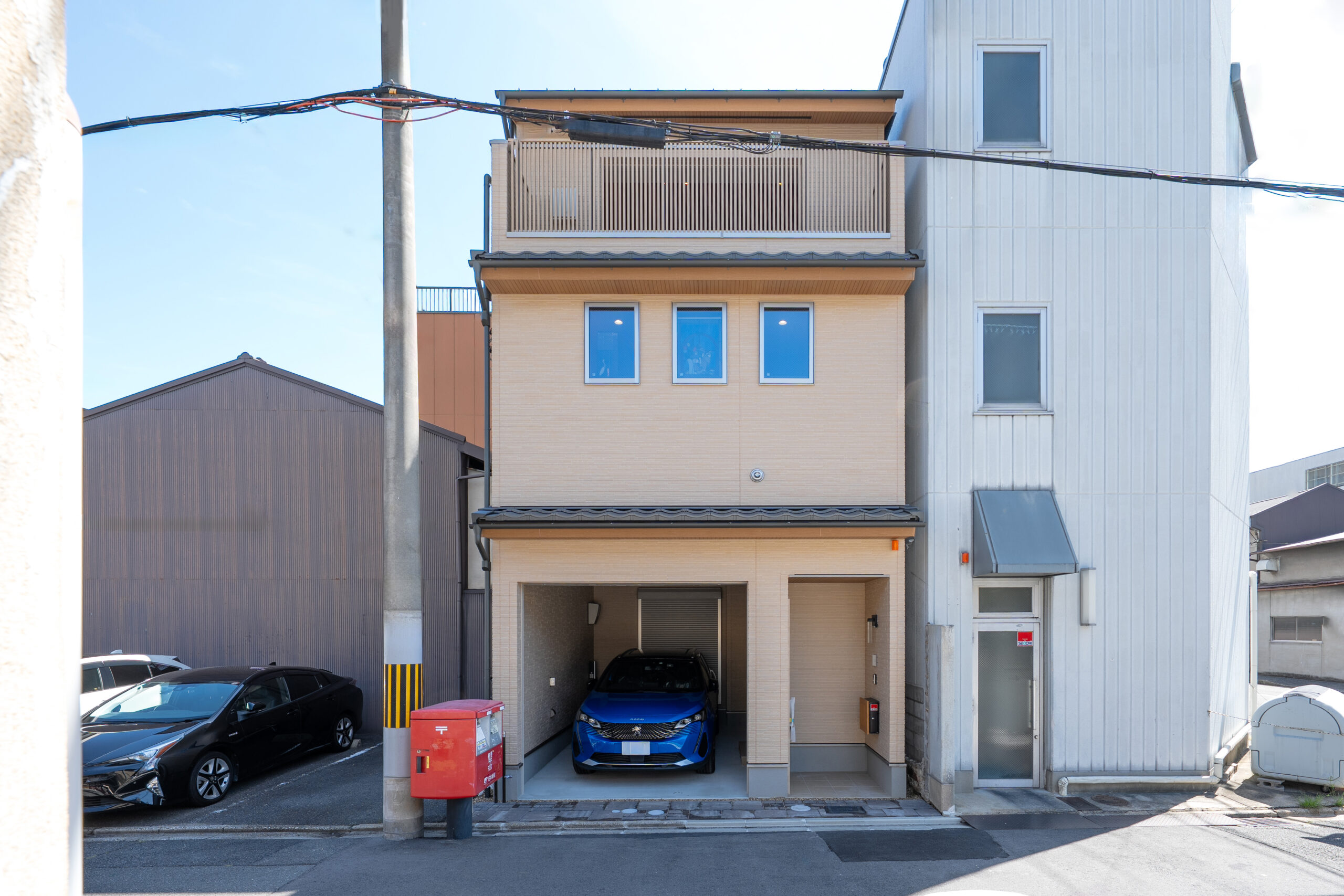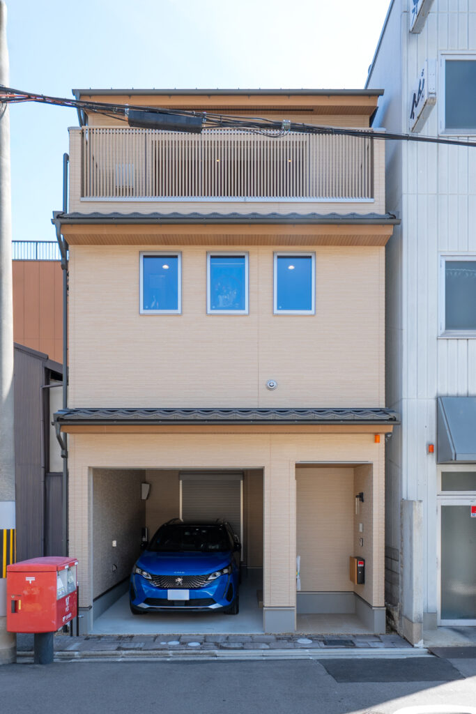 1階は旅館、2−3階は洋館を思わせるU様邸の外観は、京都の街並みに溶け込む木と瓦をあしらった優しいデザイン。