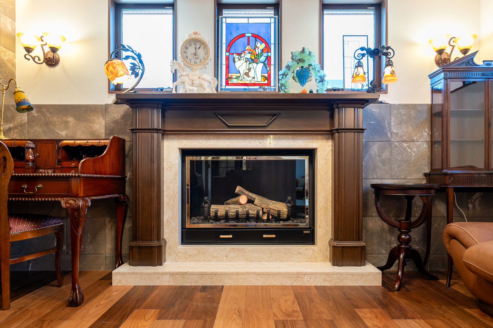 暖炉の後ろから繋がっているアクセントウォールが、洋館の雰囲気を演出。